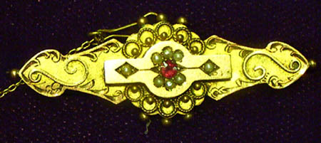 Ladies Victorian 9ct gold bar brooch, consisting of a central set ruby surrounded by eight seed pearls, lovely condition. Circa 1890.