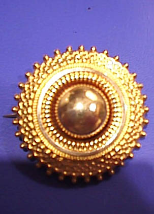 Antique gold circular design brooch with locket compartment at the back, Etruscan style. Very good condition and possibly in original box.