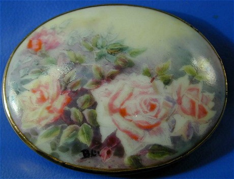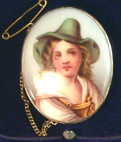A delightful hand painted miniature on porcelain in 9ct antique gold brooch mount. Circa 1890. Beautiful condition.