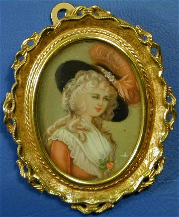 Hand painted miniature on ivory of a lady. The miniature painting in-set with small diamonds in her hat. The miniature in heavy 18ct gold brooch mount which can also be worn as a pendant. A lovely piece.