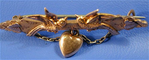 Victorian 9ct gold bird and heart bar brooch. In good condition with very small indentation on end of bar.