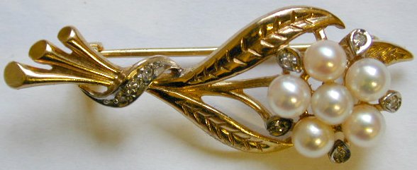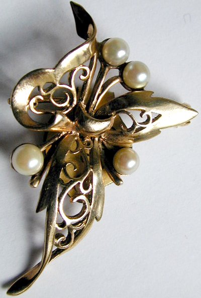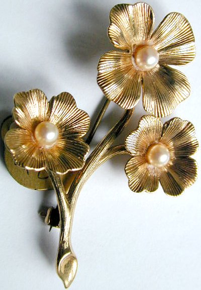 Super quality, fully hallmarked, 1960's 9 Carat gold brooch consisting of 3 stylised flower heads each on a stem.  Each individual flower head set with a cultured pearl, also with a locking clasp.