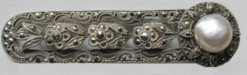 1930's Are Deco, silver and marcasite clip set with a large Baroque natural pearl.