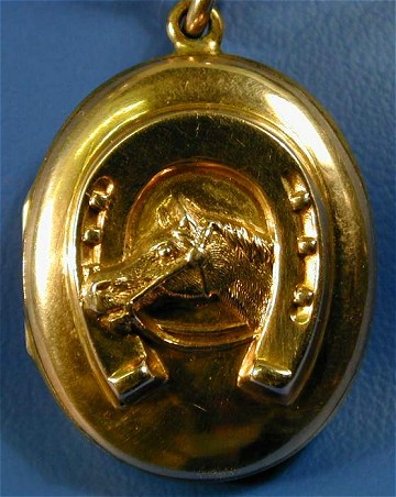 Antique gold Victorian hinged locket. One side decorated embossed horses head and horse show, and the other sise engraved with flowers, leaves etc.. Circa 1880. This appears to have been hardly used.