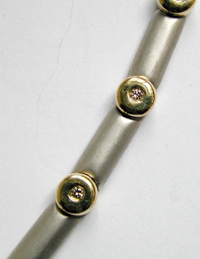 The chain, consisting of interwoven links, with, cylindrical white gold every link. Aproximatly 18" in length, with tiger clasp, a beautiful piece which has a lovely design.