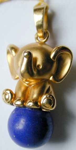 18ct Gold beautiful quality baby elephant pendant, consisting of 18ct yellow gold elephant with matt finish, sat on a ball carved out of lapis lazuli.