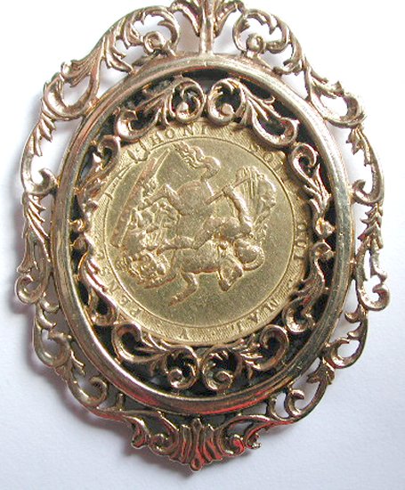 Rare George III 1820 22 Carat gold full Sovereign, in a super quality pierce work mount, which opens up so the coin can be turned around.  The pendant then hung on a heavy Belcher link chain.