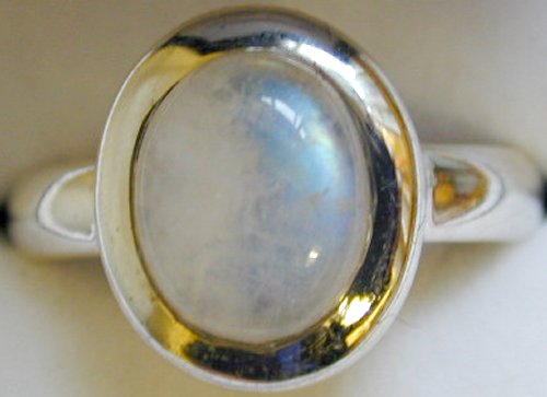 Fancy silver ring set with a moonstone in the centre.  Size O, R.