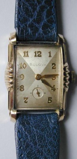 Classic 1940's Bulova rectangular shaped 10 carat gold filled wristwatch.The watch with "quartered" original silvered dial(showing some signs of ageing but still very clean) with subsidiary seconds dial at 6 o clock,gilt hands handwound movement and stylized case.a lovely Art Deco style watch from the 1940's in superb original condition