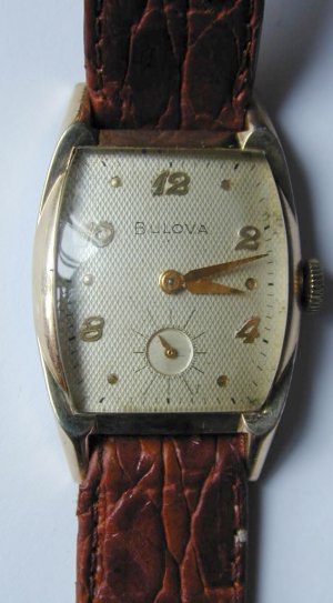 Classic 1940's Bulova tonneau shaped 10 carat gold filled wristwatch.The watch with engine turned dial with subsidiary seconds dial at 6 o clock,gilt hands handwound movement and stylized lugs.a lovely Art Deco style watch from the 1940's in superb original condition