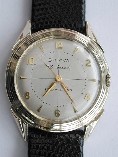 Classic 1958 23 jewel automatic self winding Bulova 10 carat gold filled wristwatch . The watch with mint condition silvered dial with alternate "arrow head" and Arabic numeral applied gold hour markers,gold filled case. A gorgeous 1950'S watch in stunning condition.