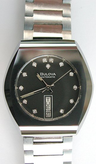 Classic 1970'S stainless steel Bulova automatic self-winding mechanical day date wristwatch. The watch with black dial with stone set hour markers aperture for day and date at 6 '0' clock, chunky screw back mirror finish steel case on Bulova steel bracelet, in excellent condition throughout, An unusual style of watch which looks strangely modern