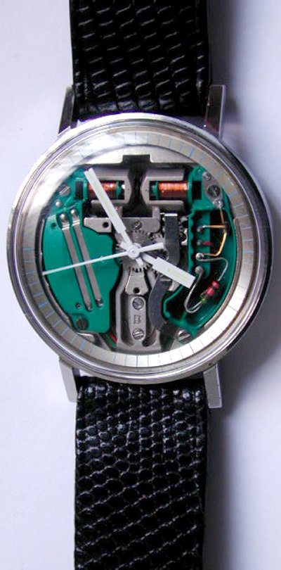Classic 1971 unusual Bulova Accutron electronic tuning fork wristwatch in stainless steel case, the watch with unusual sweep center seconds hand. The case back with long service inscription. An unusual model of which I have not seen before