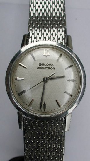 Classic 1964 Bulova Accutron electronic tuning fork wristwatch in stainless steel case,the time is adjusted using a lever on the case back,the back is the same as shown on the Accutron which has sold lower down this pageCLICK HERE TO VIEW FROM CASE BACK. The Accutron marks a benchmark in watchmaking history as it was one of the first watches to go into full production which was driven by a battery instead of a spring. The watch with silvered dial on stainless steel bracelet.