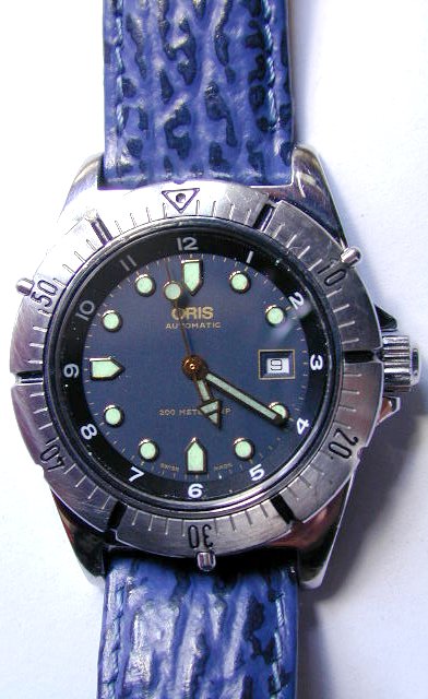 The watch is still on the original Oris blue leather strap. Diameter of watch head is
