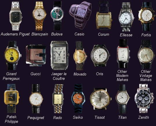 Audemars Piguet Blancpain Bulova Casio Corum Ellesse Fortis Girard Perregaux Gucci Jaeger le Coultre Movado Oris Patek Philippe Pequignet Rado Seiko Tissot Titan Zenith