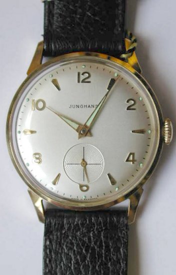 Brand new ex-shop stock, this hand wound watch, made in the 1950's by Junghans of Germany , has applied gold and luminous hour markers and hands. It has a stainless steel snap on back and also has an heavily gold plated case. The watch also has a subsidiary seconds dial mounted on the silvered dial at 6 o'clock.