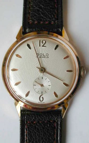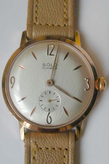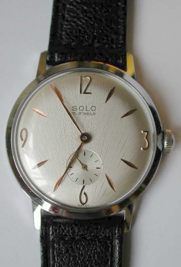 Brand new ex-shop stock, 1950's 15 jewel hand wound wrist watch made by Solo.  The watch consisting of superb, engine turned sunburst silvered dial and stainless steel screw back. Applied rose gold and Arabic hour markers at 12 and 6 o'clock, and a subsidiary seconds dial, also at 6 o'clock.  The watch also comes complete with the original tan-leather strap defiantly a very eloquent style of watch. Old but brand new.