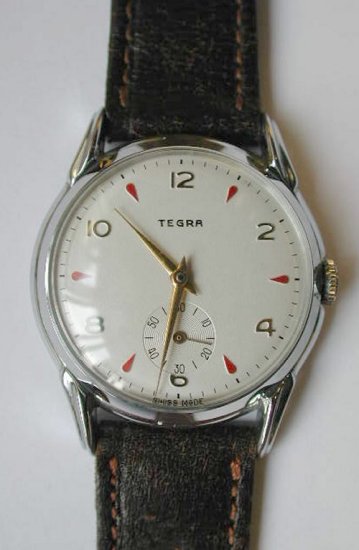 Brand new ex-shop stock, hand wound wrist watch made by Tegra in the 1950's, this watch has applied rose-gold and very unique red arrowhead hour markings.