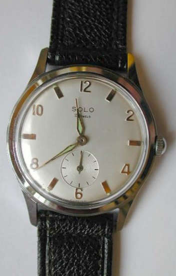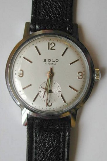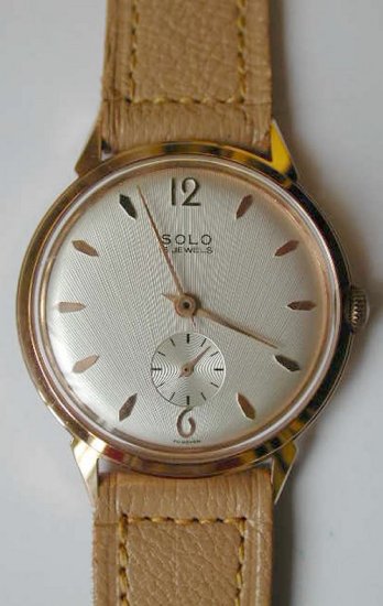 Hand wound mechanical, 15 Jewel, 1950's wrist watch, by Solo.  Brand New Ex-Shop Stock, the watch with a silver dial an subsidiary seconds dial, with applied rose-gold Arabic, baton style hour markers, and luminous and gold coloured hands. Screw back case. This watch still has the original price ticket on the back of the case from the 1950's which then cost £5 & 5 shillings which was, a considerable amount at the time.