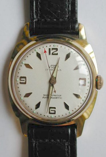 Brand new ex-shop stock, 1950's Vidar 17 Jewel hand wound wrist watch, the watch consisting of a silver dial, with applied rose-gold Arrowhead and Arabic numeral hour markers. Gold plated case with stainless steel screw on back, the watch even with original shop stock tag.