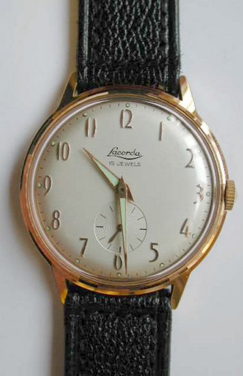 Brand new ex-shop stock, hand wound mechanical 15 jewel, 1950's wrist watch by Lacorada.  The watch consists of, a silver dial with a subsidiary seconds dial.  Applied rose-gold Arabic style hour markers.  Luminous and gilt hands, heavy rose-gold plated case with screw on stainless steel back.