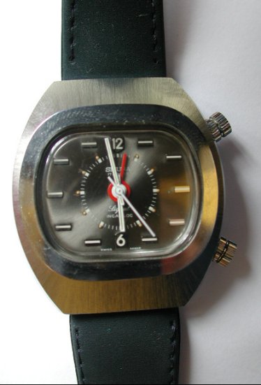 The watch with a black iridescent dial, and white baton style hands, with a sweep seconds hands.  The watch has two winding screws mounted on the side of the watch at 2 and 4 o'clock one of which is for time setting and the other for the alarm, which is indicated on the dial by a red stubby style baton shaped hand.