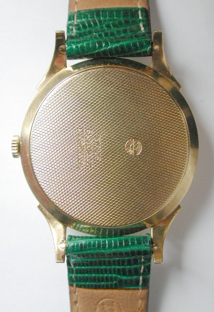 The watch with applied gold baton style applied gold hour markers. and a lovely gauze effect rolled gold case back.