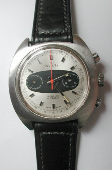 Gents 1970's 17 Jewel, hand wound mechanical Chronograph. The watch, made by Invicta, hewn from a single ingot of stainless steel, has silvered, black and luminous hands and baton style hour markers,Invicta engraved stainless steel screw back case and red seconds hand.