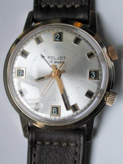 Brand new Ex-Shop stock 1960'S Poljot(pronounced Pilot) Russian mechanical hand wound alarm wristwatch with silvered dial gold plated case with screw on steel back.An interesting complicated watch which has a very loud alarm,which is so loud it would virtually wake the dead,we have 3 of these available